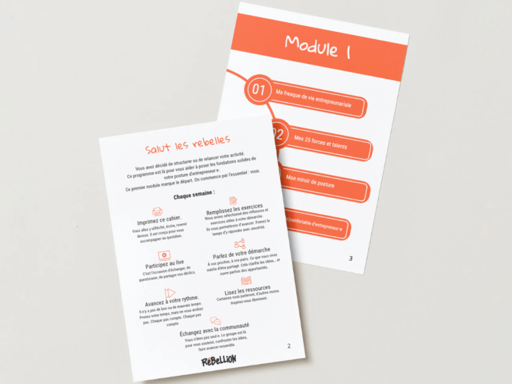 Un cahier de réflexion par module, avec des questions précises et des exercices concrets. Vous savez exactement quoi faire entre chaque live, étape par étape.