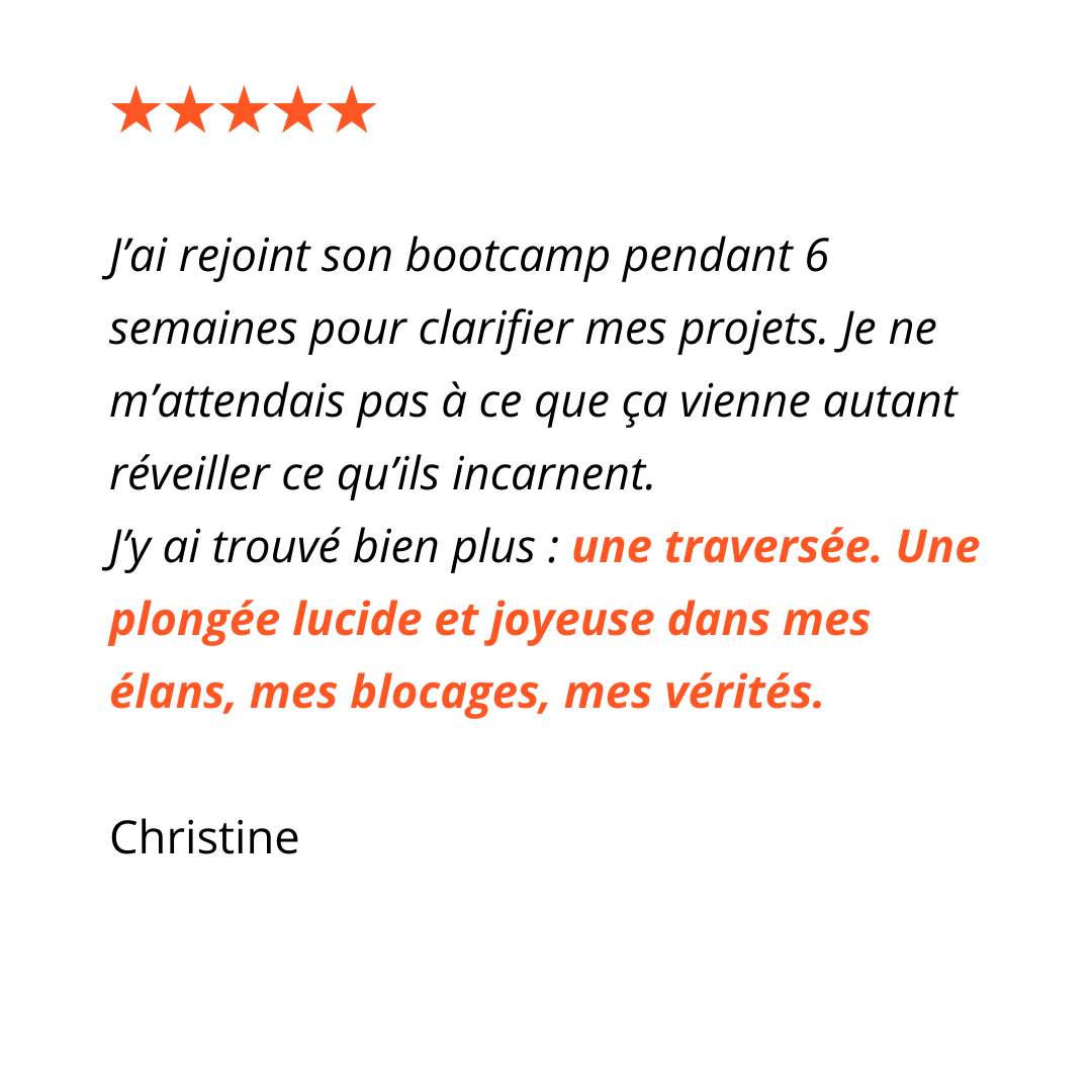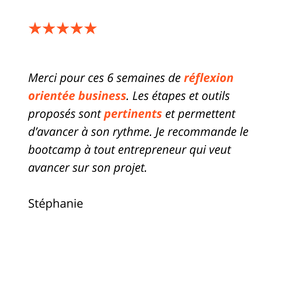 Le bootcamp vous aide à clarifier votre projet, à choisir une direction réaliste et à construire une offre qui tient la route, étape par étape.