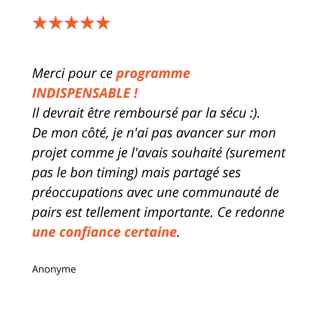 Un espace sécurisé pour échanger sur vos avancées, poser vos questions et profiter de la dynamique du groupe entre les sessions.